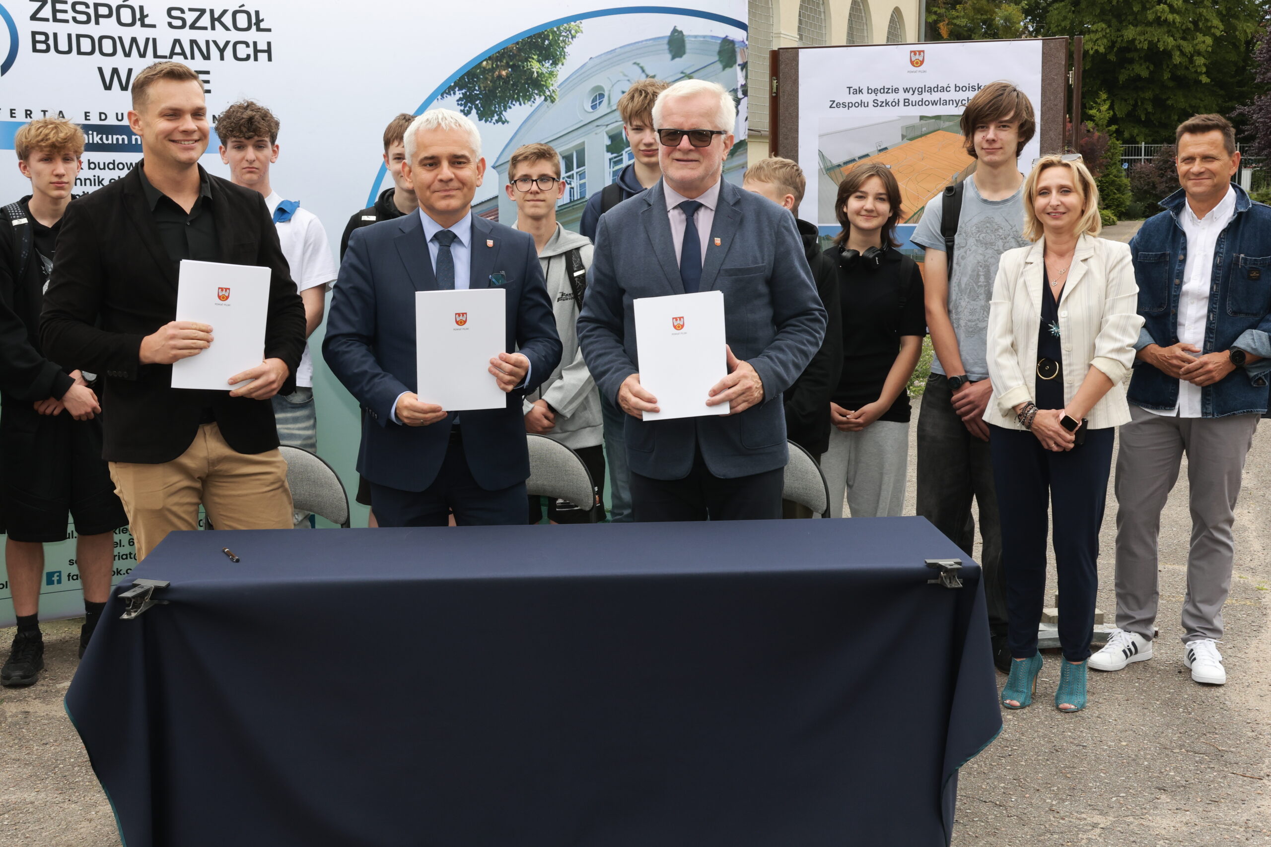 Dzisiaj została podpisana umowa na budowę boiska wielofunkcyjnego przy ZSB w Pile. W imieniu Starostwa Powiatowego umowę podpisali Starosta Pilski pan Rafał Zdzierela i Wicestarosta Pilski pan Stefan Kowal w obecności Dyrektor ZSB w Pile pani Kariny Mazurek i nauczyciela w-fu Arkadiusza Jeża oraz przedstawicieli uczniów. Ze strony wykonawcy podpis złożył pan Marcin Kilichowski reprezentujący Przedsiębiorstwo Handlowo-Usługowe INSTAL ZŁOTÓW.