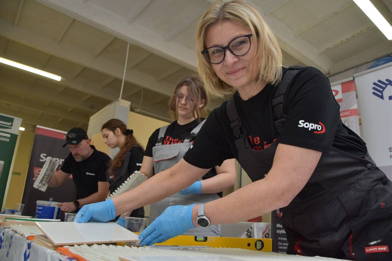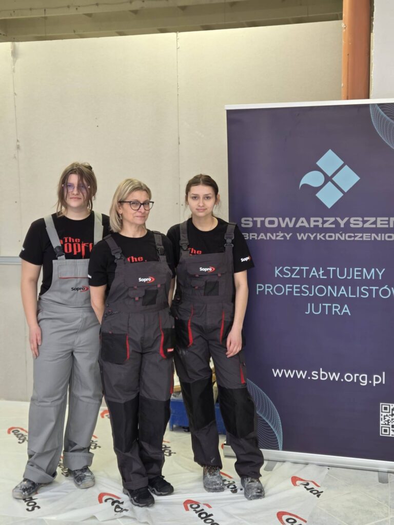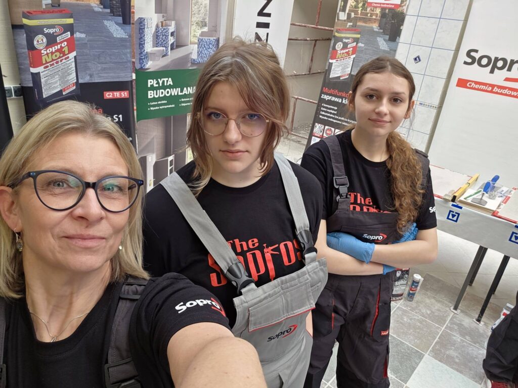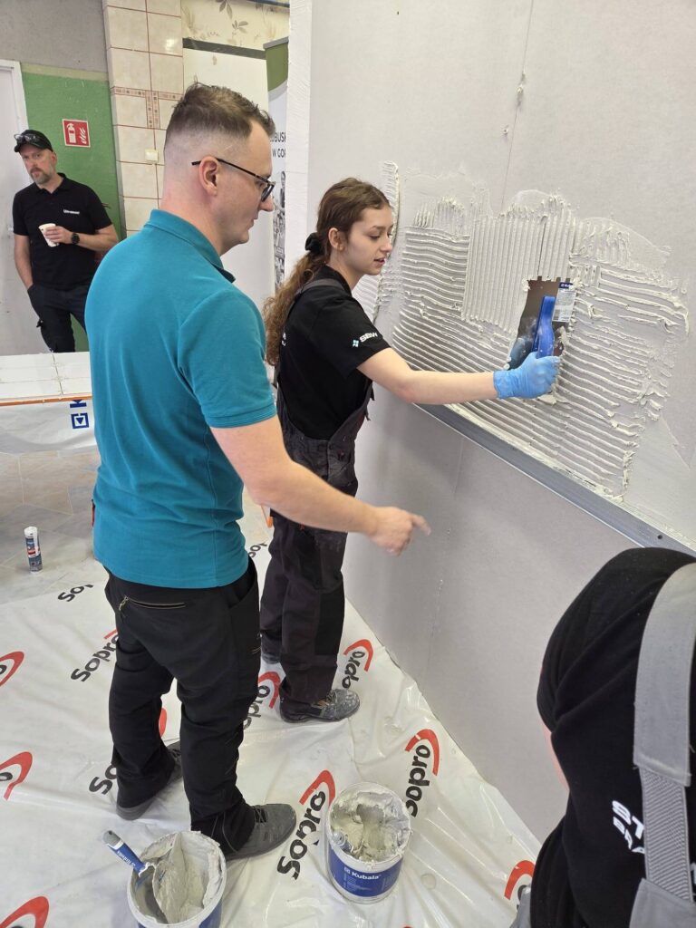 Jak poprawnie przykleić płytki i jak je fugować? Tego w dniu 7 marca 2026r. w Zielonej Górze uczyły się kobiety z całej Polski. W warsztatach udział wzięły również dwie uczennice klasy drugiej Branżowej Szkoły I Stopnia w Zespole Szkół Budowlanych w Pile, Paulina Fatyga i Aleksandra Wiśniewska, jedyne dwie uczennice uczące się w zawodzie Monter Zabudowy i Robót Wykończeniowych w Budownictwie, oraz ich nauczyciel zawodu Pani mgr inż. Katarzyna Nurska. Oprócz przyklejania i fugowania płytek Panie uczyły się jak poprawnie położyć silikon, jak przeciąć płytki, aby nie pękły, a poza tym każda sama wykonała mały stołeczek z płyty budowlanej DoIT.