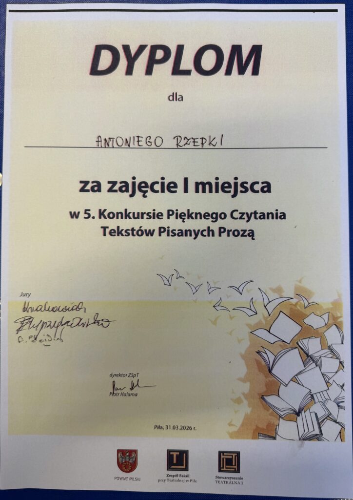 Antoni Rzepka z klasy 5B zajął i miejsce w 5. Konkursie Pięknego Czytania tekstów Pisanych Prozą. Gratulujemy serdecznie!