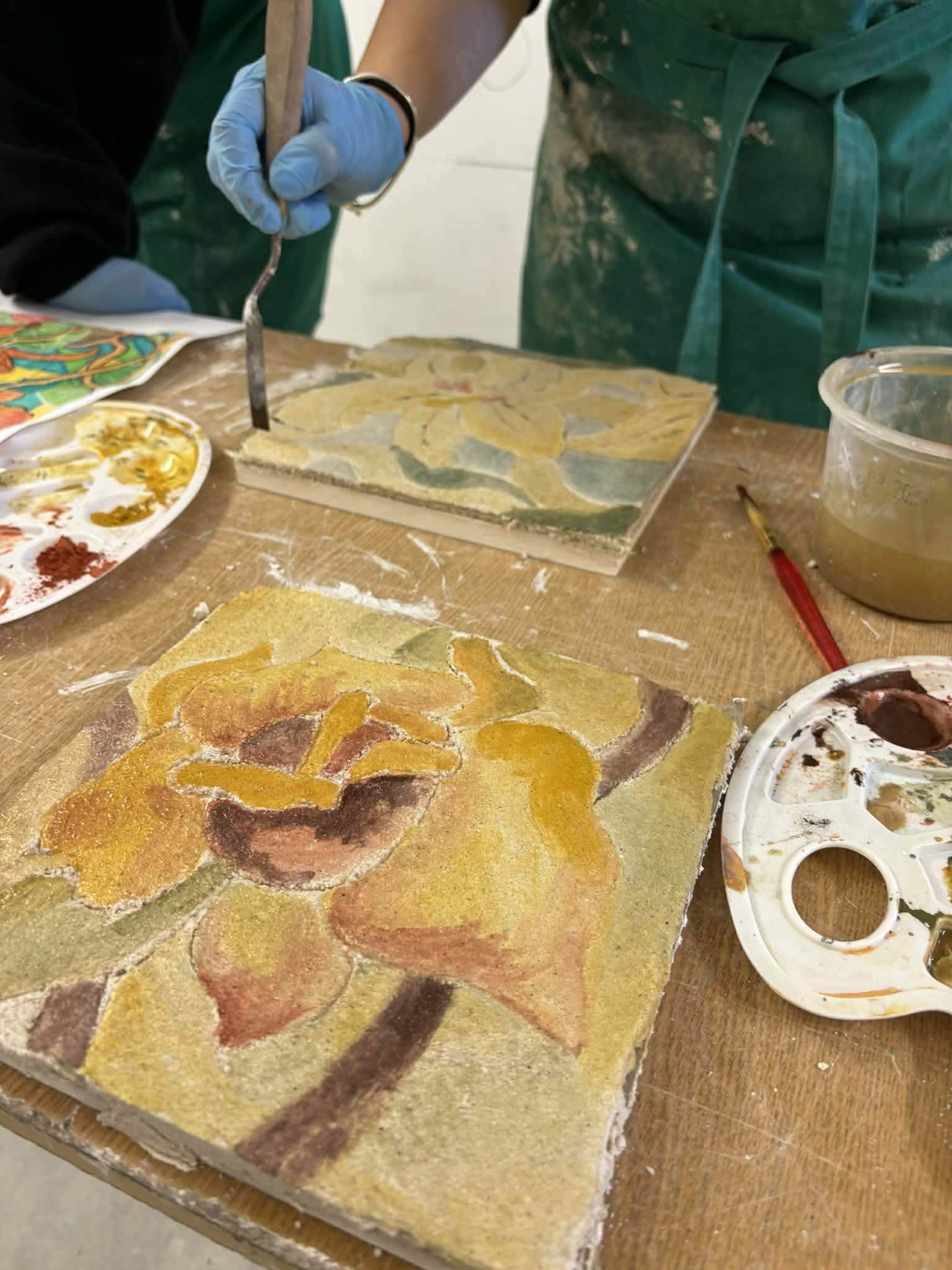 Podczas warsztatów uczestnicy mieli okazję praktycznie zapoznać się z techniką wykonania fresku na mokro, przygotowania podobrazia, zrobienia małej intarsji oraz wyciągania listew sztukatorskich. Wszystkie warsztaty odbywały się z myślą o poszerzaniu umiejętności i lepszym poznaniu zagadnień związanych z renowacją.