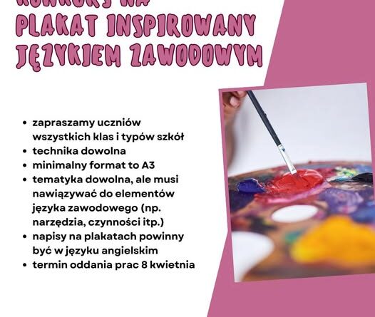 Zapraszamy wszystkich uczniów do udziału w konkursie plastycznym na plakat inspirowany językiem zawodowym. Tematyka plakatu dowolna: mogą to być narzędzia,